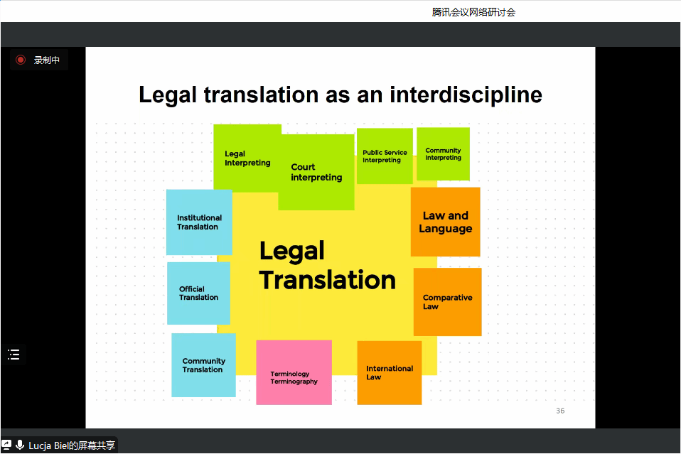 Biel教授首先将法律翻译定以为市场实践并将其分类,探讨了法律翻译机遇与挑战。然后Biel教授聚焦领域创新,例如法律翻译的日趋增长的可及性与功能性,以及法律翻译科技化与职业化。最后,Biel教授从环境、译者、过程、产品、接受五个维度对法律翻译领域研究的发展趋势做了综述。