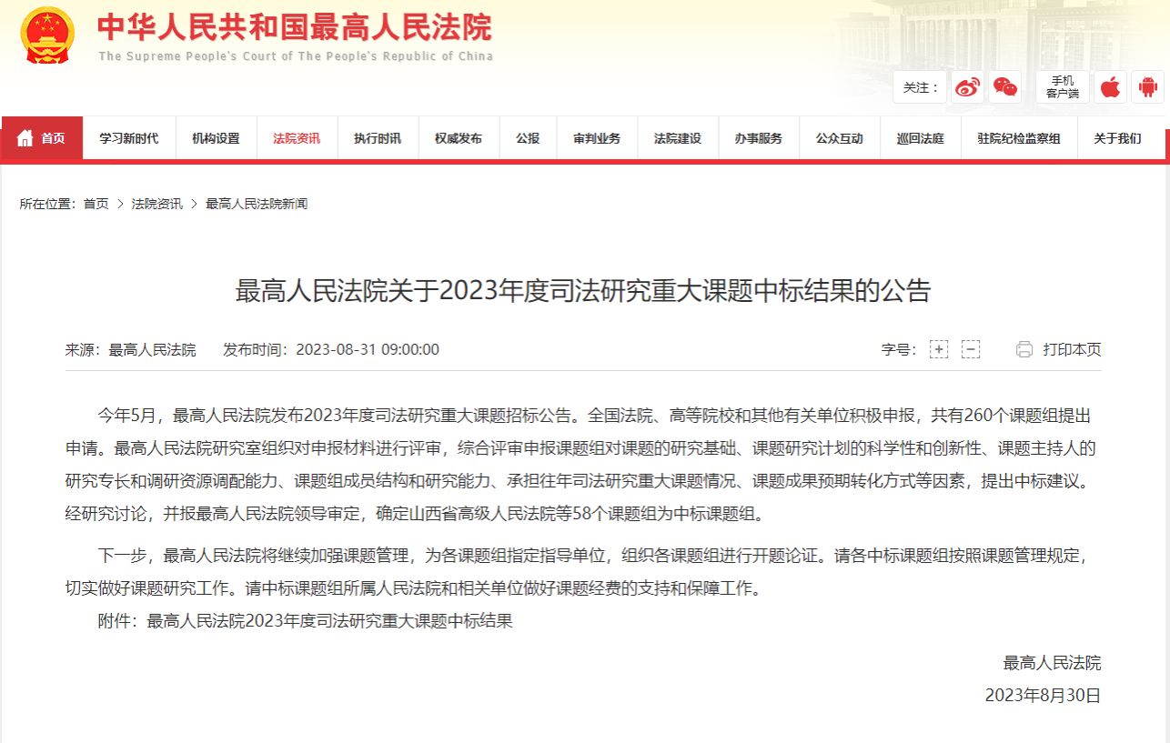2023年度司法研究重大课题中标结果