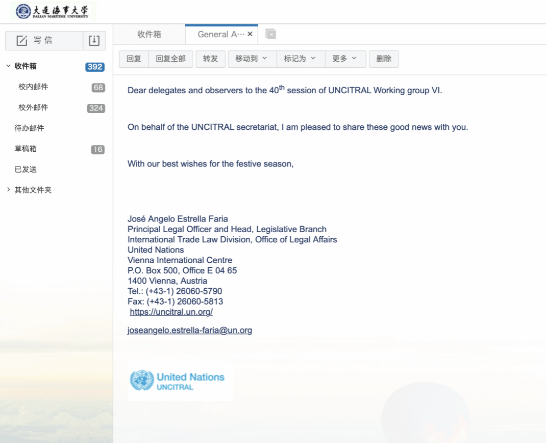 2022年12月,我校收到联合国贸法会立法首席官关于《北京船舶司法出售公约》批准通过的邮件。