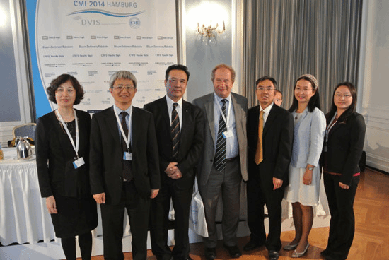 2014年6月,李海教授(左三)、韩立新教授(左一)参加国际海事委员会第41届国际会议及会员大会,在会上阐明了就有关问题的意见和观点并被采纳,《关于外国船舶司法出售及其承认的国际公约草案》(简称“北京草案”)获得通过。