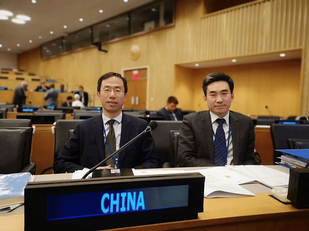 2019年5月,初北平教授(右)和朱作贤教授(左)作为中国代表团成员赴纽约曼哈顿联合国总部参加联合国贸易法委员会第六工作组第35届会议,就“北京草案”是否可以作为会议讨论的基础案文进行一般性辩论。