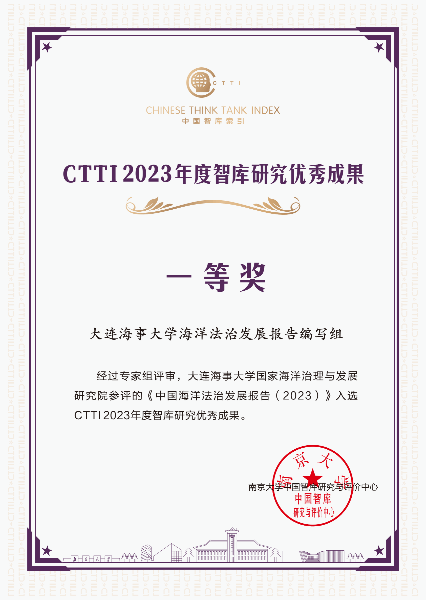 在12月11日公布的中国智库索引(CTTI)2023年度“智库建设最佳案例”和“智库研究优秀成果奖”评选中,我校智库首次推荐申报即斩获多项奖项。其中,大连海事大学国家海洋治理与发展研究院《 坚持一流发展 打造新型智库》入选2023年度CTTI智库建设最佳案例示范案例;研究院智库品牌产品《中国海洋法治发展报告(2023)》荣获智库研究优秀成果一等奖。
