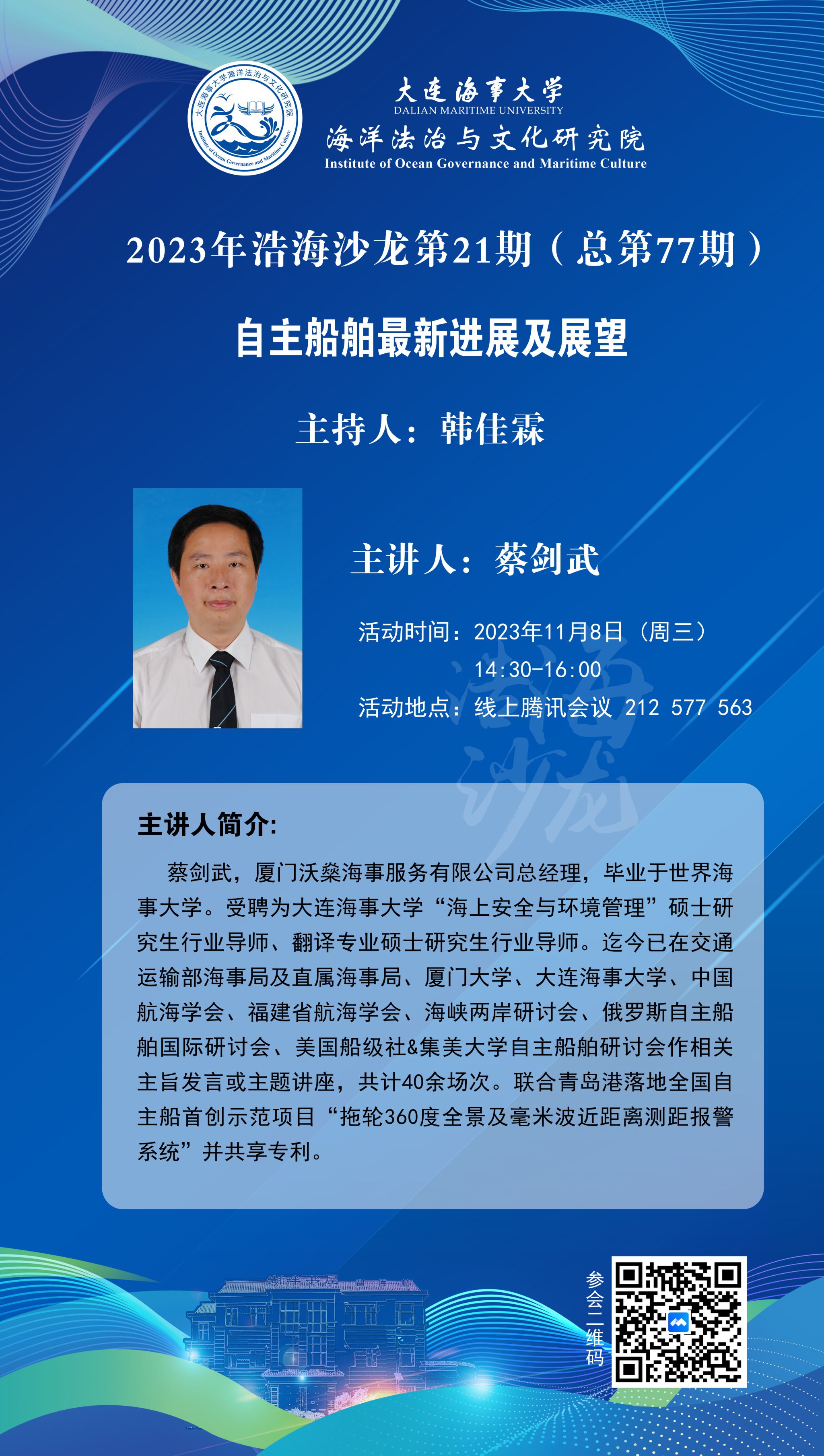 蔡剑武,厦门沃燊海事服务有限公司总经理,毕业于世界海事大学。受聘为大连海事大学“海上安全与环境管理”硕士研究生行业导师、翻译专业硕士研究生行业导师。迄今已在交通运输部海事局及直属海事局、厦门大学、大连海事大学、中国航海学会、福建省航海学会、海峡两岸研讨会、俄罗斯自主船舶国际研讨会、美国船级社&集美大学自主船舶研讨会作相关主旨发言或主题讲座,共计40余场次。联合青岛港落地全国自主船首创示范项目“拖轮360度全景及毫米波近距离测距报警系统”并共享专利。