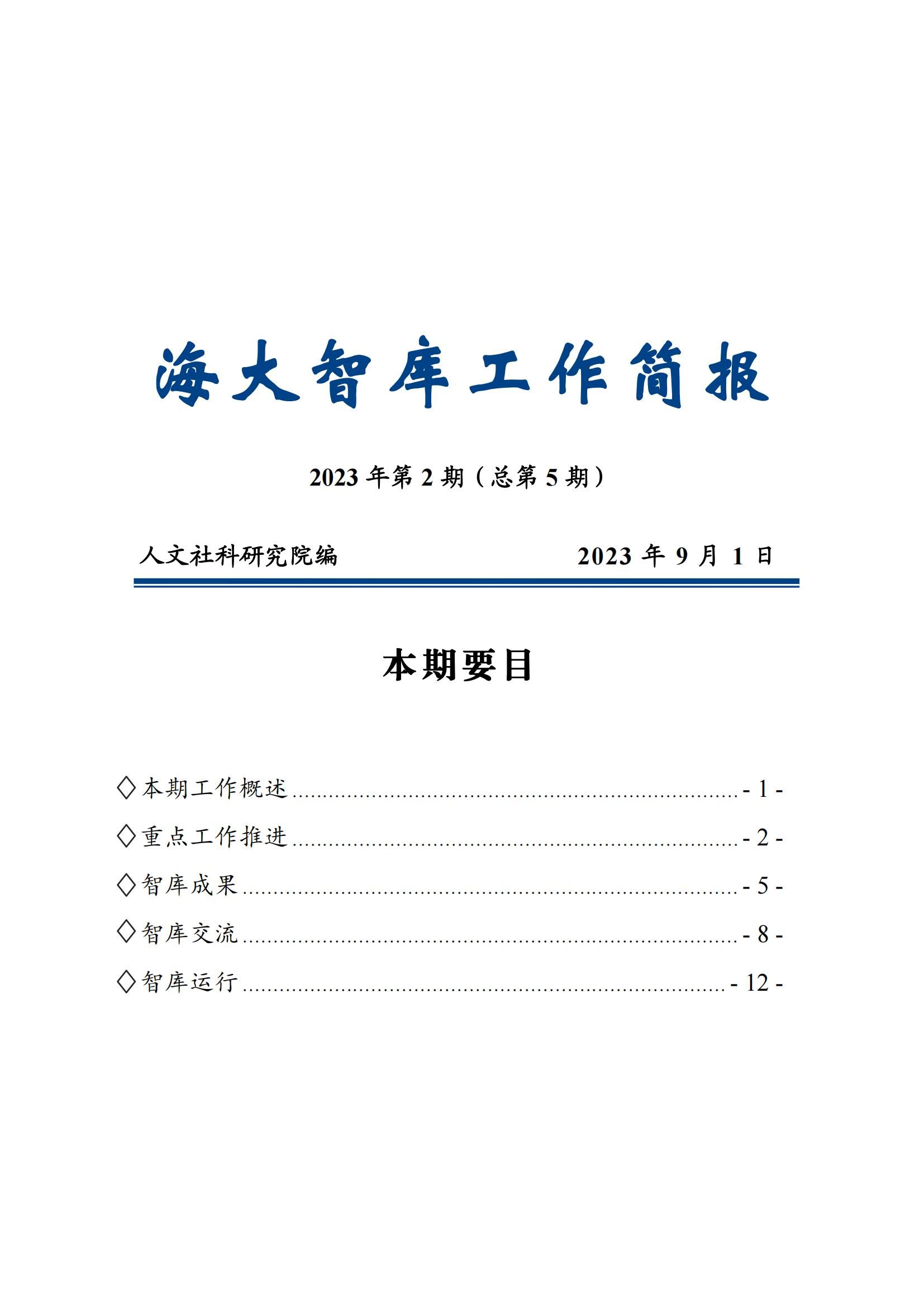 为方便校内师生集中了解学校智库工作开展情况,更好地参与到智库研究相关工作,人文社科研究院于2022年特别推出《海大智库工作简报》。今日,《海大智库工作简报》2023年第2期(总第5期)正式出刊,内容涵盖工作概述、重点工作推进、智库成果、智库交流、智库运行等五个方面。