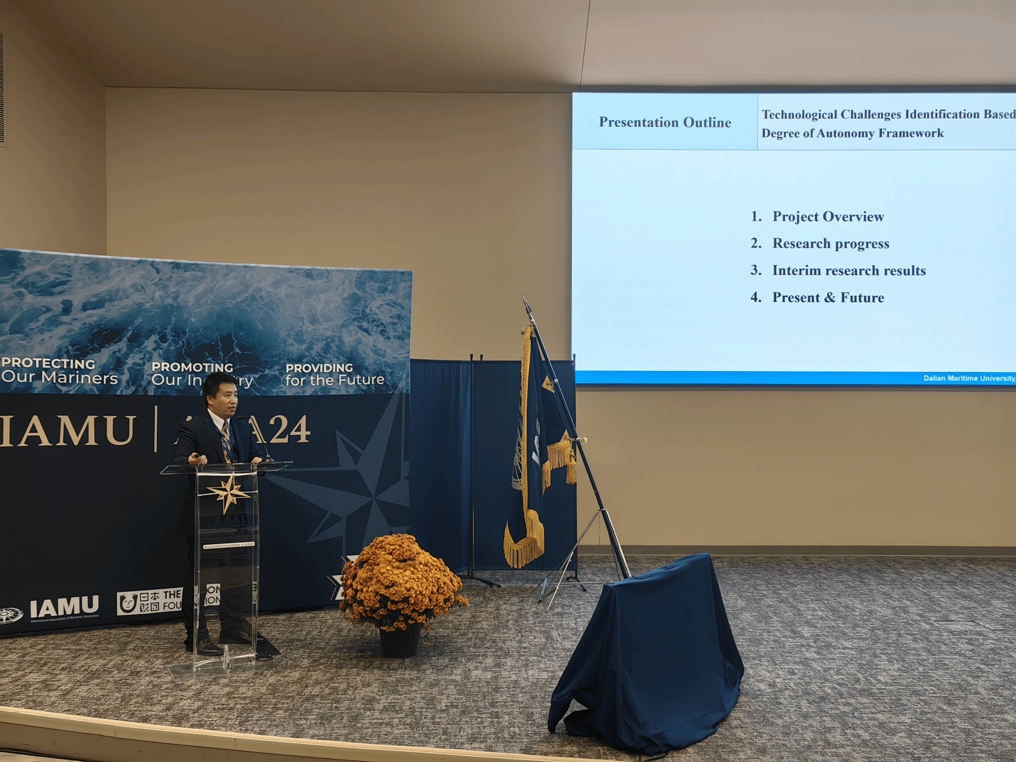 在大会报告环节共有9位代表作了主题发言,联合会2024年度研究课题获得者、航海学院教师张若澜作了题为Technological Challenges Identification Based on MASS Degree of Autonomy Framework的发言,联合会2024年度组织发展课题获得者、航海学院教师王焕新作了题为IAMU Framework for Collection of Information on Graduate Employment的发言,并同时回答了现场听众的提问,展现了我校教师良好的研究水平。