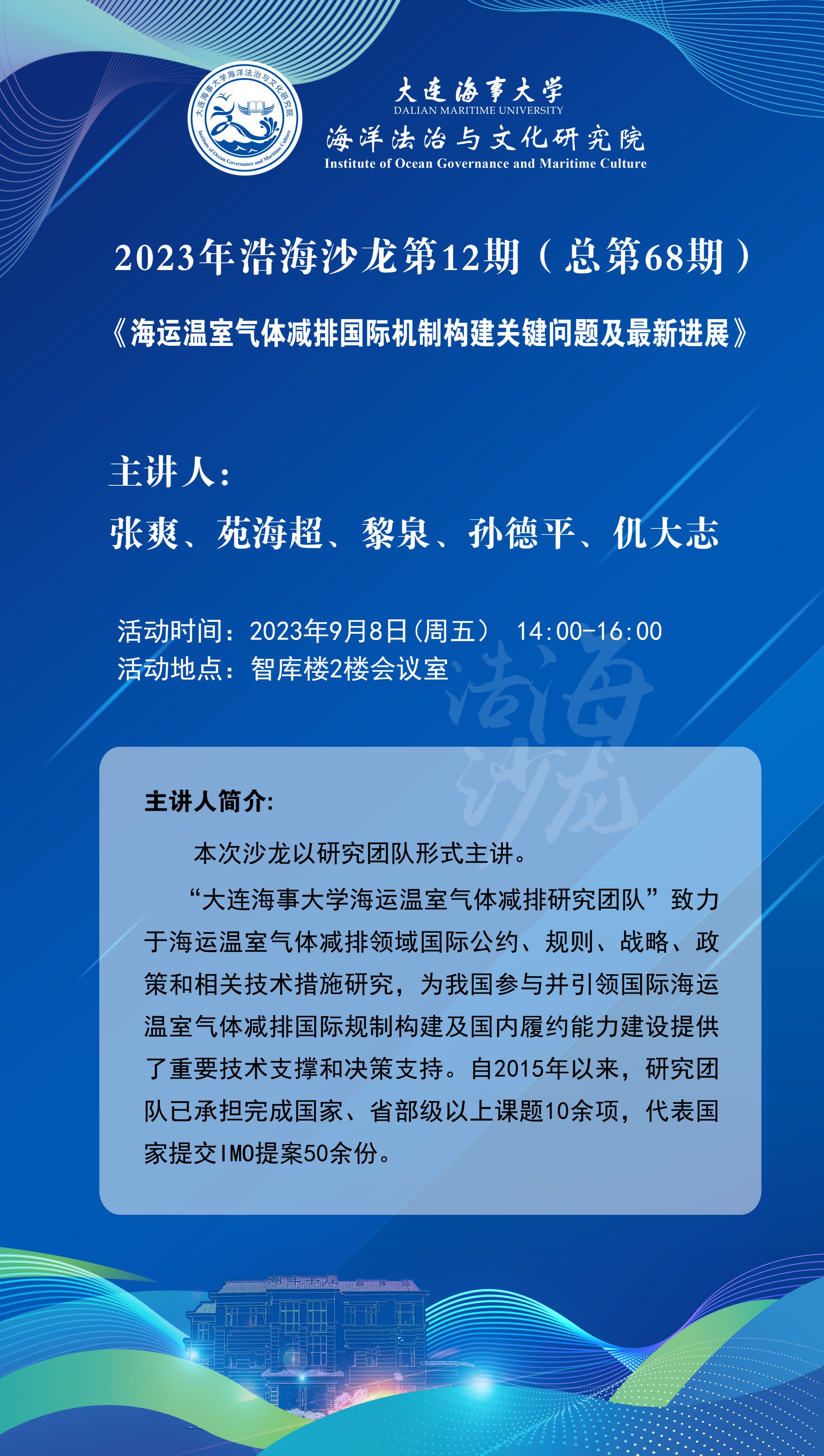 “大连海事大学海运温室气体减排研究团队”致力于海运温室气体减排领域国际公约、规则、战略、政策和相关技术措施研究,为我国参与并引领国际海运温室气体减排国际规制构建及国内履约能力建设提供了重要技术支撑和决策支持。自2015年以来,研究团队已承担完成国家、省部级以上课题10余项,代表国家提交IMO提案50余份。